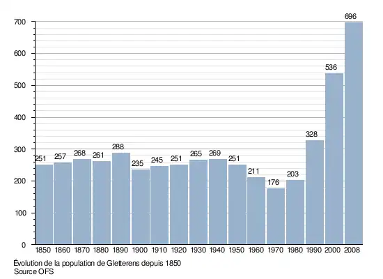 Le graphique suivant résume l'évolution de la population de Gletterens entre 1850 et 2008[3] :