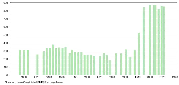 L'évolution du nombre d'habitants est connue à travers les recensements de la population effectués dans la commune depuis 1793. Pour les communes de moins de 10 000 habitants, une enquête de recensement portant sur toute la population est réalisée tous les cinq ans, les populations de référence des années intermédiaires étant quant à elles estimées par interpolation ou extrapolation[31]. Pour la commune, le premier recensement exhaustif entrant dans le cadre du nouveau dispositif a été réalisé en 2008[32].
