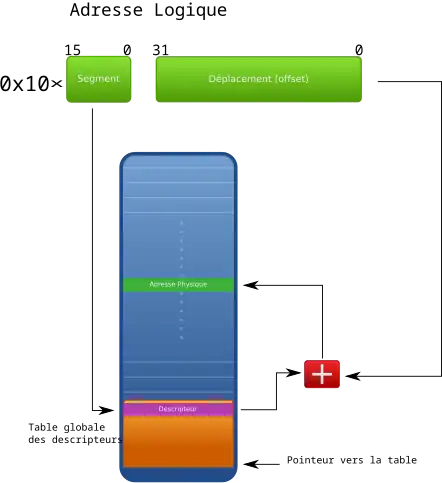 En mode protégé, les adresses de segments contenues dans les registres de segments CS, DS, ES et SS ont toujours 16 bits mais ne représentent plus des endroits physiques. Les registres de segments contiennent des « sélecteurs », dont une partie sert d'indice dans GDT où se trouvent décrits les segments de la mémoire. En consultant cette table, le processeur prend connaissance de l'adresse de base du segment. Enfin l'adresse finale est déterminée en ajoutant un décalage donné sous la forme d'un pointeur FAR à l'adresse trouvée.