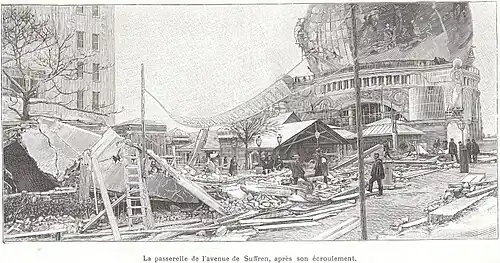 Le , la passerelle de ciment armé menant à l'attraction et surplombant l'avenue de Suffren s'est effondrée, faisant 9 morts et plusieurs blessés graves[3]. Cet accident amènera le gouvernement à s'intéresser au nouveau matériau qu'était le béton armé et à essayer d'en définir les règles d'usage. La Commission du ciment armé, sera créée à cet effet, par l'arrêté ministériel du .
