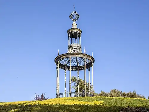 Vue rapprochée de la structure métallique au sommet de la gloriette.
