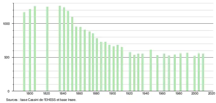 L'évolution du nombre d'habitants est connue à travers les recensements de la population effectués dans la commune depuis 1793. À partir du , les populations légales des communes sont publiées annuellement dans le cadre d'un recensement qui repose désormais sur une collecte d'information annuelle, concernant successivement tous les territoires communaux au cours d'une période de cinq ans. Pour les communes de moins de 10 000 habitants, une enquête de recensement portant sur toute la population est réalisée tous les cinq ans, les populations légales des années intermédiaires étant quant à elles estimées par interpolation ou extrapolation[29]. Pour la commune, le premier recensement exhaustif entrant dans le cadre du nouveau dispositif a été réalisé en 2004[30],[Note 1].