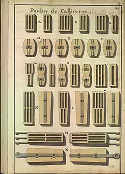 - caliorne : une caliorne est un assemblage de deux fortes poulies à deux ou trois rouets, dans lesquelles passe un cordage de grosseur proportionnée appelé garant et dont l'une des extrémités fait estrope sur l'une des poulies [11]. La caliorne est plus forte qu'un palan.