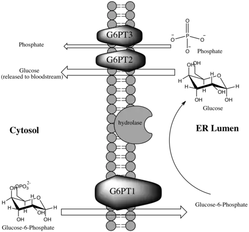 La glucose-6-phosphate translocase est une enzyme codée chez les humains par le gène SLC37A4[1],[2]. Elle se compose de trois sous-unités qui sont chacune des composants essentiels du complexe formé avec la glucose-6-phosphatase (G6Pase). Ce complexe enzymatique se trouve dans la membrane du réticulum endoplasmique et catalyse les réactions finales de la glycogénolyse et de la néoglucogenèse[3]. Le complexe G6Pase est le plus abondant dans les tissus du foie mais est également présent dans les cellules des reins, de l'intestin grêle, des îlots de Langerhans et, en moindres quantités, dans la vésicule biliaire[4],[5]. Ce complexe enzymatique est fortement impliqué dans la régulation homéostatique de la glycémie. En ce qui concerne le glucose, les sous-unités de la translocase sont responsables du transport des substrats et des produits de la réaction d'hydrolyse de la phosphatase à travers la membrane du réticulum endoplasmique, ce qui permet la libération du D-glucose dans le sang.