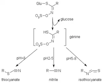 - si le pH est neutre, il se forme un isothiocyanate, très réactif, volatil, à forte odeur et à goût amer. C'est le produit d'hydrolyse dominant pour beaucoup d'espèces.