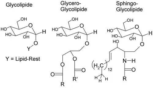 Les glycolipides résultent de la liaison d'un simple hexose ou d'un oligosaccharide à une fonction hydroxyle appartenant soit au glycérol d'un diglycéride (glycéroglycolipide) soit à la sphingosine d'un céramide (sphingolipide).