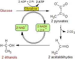 - Enfin, chez des micro-organismes comme les levures et dans les tissus de certaines plantes, le pyruvate peut être réduit en alcool éthylique (éthanol), là aussi avec oxydation couplée du NADH en NAD+. C'est la fermentation alcoolique.