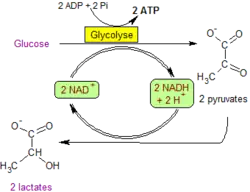 | Fermentation lactique : la régénération du NAD+ est assurée par la réduction directe du pyruvate en lactate pyruvate + 2 H+ + 2 e− → lactate |