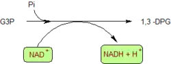 | Oxydation couplée à une phosphorylation du glycéraldéhyde-3-phosphate (G3P) en 1,3-bisphosphoglycérate (1,3-BPG) |