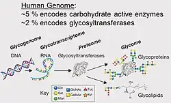 On parle parfois de glycomique (glycomics pour les anglophones), par analogue à génomique et à la protéomique pour désigner l'étude systématique de tous les glycanes des structures d'un type cellulaire donné ou d'un organisme. C'est un sous-ensemble de la glycobiologie[1].