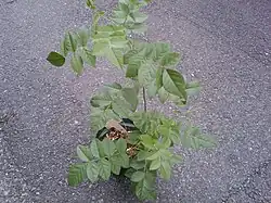 Les feuilles sont composées imparipennées, de 5 à 20 cm de longueur, à 5 à 17 folioles, avec un pétiole glandulaire ; les folioles sont ovales ou orbiculaires, densément glanduleuses, pubescentes.