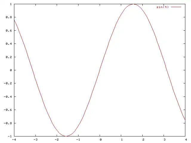 gnuplot> set terminal png Terminal type set to 'png' Options are ' small color' gnuplot> set output "exemple1.png" gnuplot> plot [t=-4:4] sin(t)