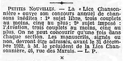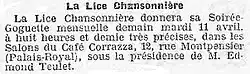 - 1 2 Rubrique Au jour le jour, La Lice Chansonnière, Le Temps, 8 avril 1881, page 2, 3e et 4e colonnes.