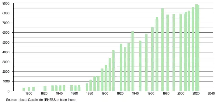 - ↑ Population municipale de référence en vigueur au 1er janvier 2025, millésimée 2022, définie dans les limites territoriales en vigueur au 1er janvier 2024, date de référence statistique : 1er janvier 2022.