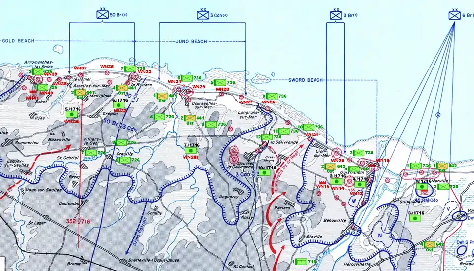 À Gold et à Juno, le triple objectif de l'armée anglo-canadienne est de prendre Bayeux, de barrer l'axe principal Bayeux-Caen à tout char allemand et d'opérer la jonction avec les Américains à Port-en-Bessin. Le soir du 6, les Britanniques ont à peu près rempli leurs objectifs avec une tête de pont de 9 km de large sur autant de profondeur. Bayeux n'est pas encore prise mais désertée par l'occupant allemand. Le en fin de matinée, ce sera la première sous-préfecture française libérée et intacte de toute destruction. Le , Port-en-Bessin est transformé en port pétrolier. Arromanches, immédiatement à l'ouest de Gold Beach est transformée en port artificiel.