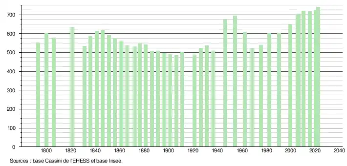 L'évolution du nombre d'habitants est connue à travers les recensements de la population effectués dans la commune depuis 1793. Pour les communes de moins de 10 000 habitants, une enquête de recensement portant sur toute la population est réalisée tous les cinq ans, les populations de référence des années intermédiaires étant quant à elles estimées par interpolation ou extrapolation[19]. Pour la commune, le premier recensement exhaustif entrant dans le cadre du nouveau dispositif a été réalisé en 2005[20].