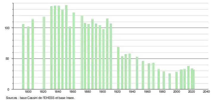 L'évolution du nombre d'habitants est connue à travers les recensements de la population effectués dans la commune depuis 1793. Pour les communes de moins de 10 000 habitants, une enquête de recensement portant sur toute la population est réalisée tous les cinq ans, les populations de référence des années intermédiaires étant quant à elles estimées par interpolation ou extrapolation[16]. Pour la commune, le premier recensement exhaustif entrant dans le cadre du nouveau dispositif a été réalisé en 2005[17].