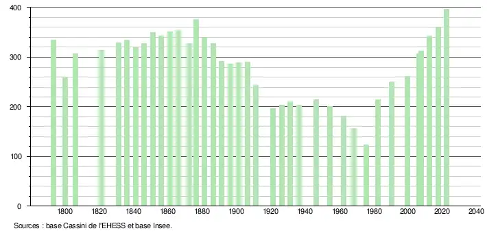 L'évolution du nombre d'habitants est connue à travers les recensements de la population effectués dans la commune depuis 1793. Pour les communes de moins de 10 000 habitants, une enquête de recensement portant sur toute la population est réalisée tous les cinq ans, les populations de référence des années intermédiaires étant quant à elles estimées par interpolation ou extrapolation[19]. Pour la commune, le premier recensement exhaustif entrant dans le cadre du nouveau dispositif a été réalisé en 2007[20].