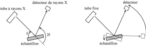 - la configuration θ-2θ (« thêta-deux thêta ») : le tube à rayons X est fixe, l'échantillon bouge d'un angle θ et le détecteur de rayons X d'un angle 2θ ; c'est la configuration la plus courante, en effet, le tube étant le dispositif le plus lourd et le plus encombrant, il est plus simple de le fixer ;