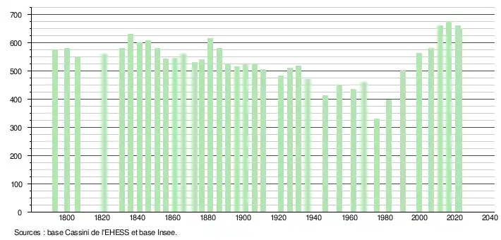 L'évolution du nombre d'habitants est connue à travers les recensements de la population effectués dans la commune depuis 1793. Pour les communes de moins de 10 000 habitants, une enquête de recensement portant sur toute la population est réalisée tous les cinq ans, les populations de référence des années intermédiaires étant quant à elles estimées par interpolation ou extrapolation[29]. Pour la commune, le premier recensement exhaustif entrant dans le cadre du nouveau dispositif a été réalisé en 2006[30].