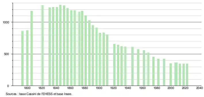 L'évolution du nombre d'habitants est connue à travers les recensements de la population effectués dans la commune depuis 1793. Pour les communes de moins de 10 000 habitants, une enquête de recensement portant sur toute la population est réalisée tous les cinq ans, les populations de référence des années intermédiaires étant quant à elles estimées par interpolation ou extrapolation[35]. Pour la commune, le premier recensement exhaustif entrant dans le cadre du nouveau dispositif a été réalisé en 2007[36].