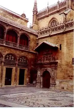 Le style Isabélin introduisit plusieurs éléments structurels de la tradition castillane et des formes flamandes flamboyantes, ainsi que quelques influences islamiques. La plupart des bâtiments qui furent construits dans ce style furent commandés par les Rois Catholiques ou étaient sous leur mécénat d'une façon ou d'une autre. En parallèle se développa au Portugal un style très similaire dit manuélin. La caractéristique la plus évidente de l'isabélin est la domination des motifs héraldiques et épigraphiques, notamment les symboles du joug et des flèches et de la grenade, qui font référence aux Rois Catholiques. Une autre caractéristique de cette période est la présence de perles pour l'ornementation à base de plâtre ou sculptés dans la pierre.