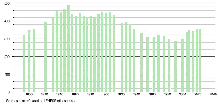 L'évolution du nombre d'habitants est connue à travers les recensements de la population effectués dans la commune depuis 1793. Pour les communes de moins de 10 000 habitants, une enquête de recensement portant sur toute la population est réalisée tous les cinq ans, les populations de référence des années intermédiaires étant quant à elles estimées par interpolation ou extrapolation[17]. Pour la commune, le premier recensement exhaustif entrant dans le cadre du nouveau dispositif a été réalisé en 2008[18].