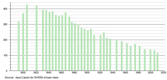 - ↑ Dans le tableau des recensements et le graphique, par convention dans Wikipédia, le principe a été retenu, pour les populations légales postérieures à 1999 de n’afficher dans le tableau des recensements et le graphique que les populations correspondant à l'année 2006, première population légale publiée calculée conformément aux concepts définis dans le décret no 2003-485 du 5 juin 2003, et les années correspondant à une enquête exhaustive de recensement pour les communes de moins de 10 000 habitants, ainsi que la dernière population légale publiée par l’Insee.
