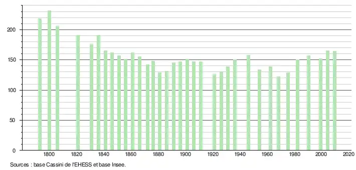 - ↑ Par convention dans Wikipédia, le principe a été retenu de n’afficher dans le tableau des recensements et le graphique, pour les populations légales postérieures à 1999, que les populations correspondant à une enquête exhaustive de recensement pour les communes de moins de 10 000 habitants, et que les populations des années 2006, 2011, 2016, etc. pour les communes de plus de 10 000 habitants, ainsi que la dernière population légale publiée par l’Insee pour l'ensemble des communes.