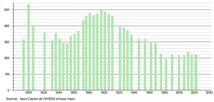 L'évolution du nombre d'habitants est connue à travers les recensements de la population effectués dans la commune depuis 1793. Pour les communes de moins de 10 000 habitants, une enquête de recensement portant sur toute la population est réalisée tous les cinq ans, les populations de référence des années intermédiaires étant quant à elles estimées par interpolation ou extrapolation[17]. Pour la commune, le premier recensement exhaustif entrant dans le cadre du nouveau dispositif a été réalisé en 2006[18].