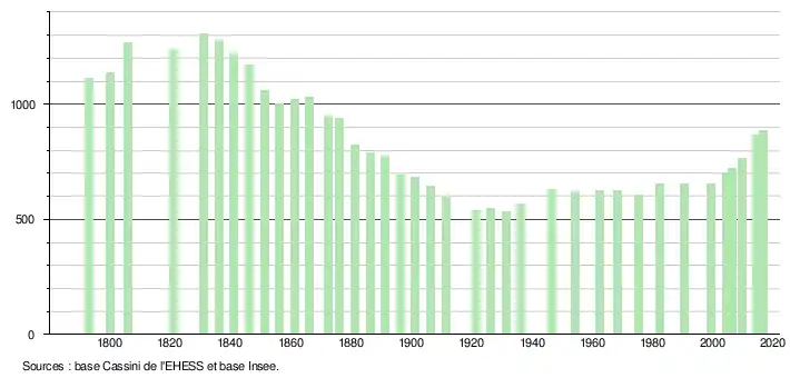 L'évolution du nombre d'habitants est connue à travers les recensements de la population effectués dans la commune depuis 1793. Pour les communes de moins de 10 000 habitants, une enquête de recensement portant sur toute la population est réalisée tous les cinq ans, les populations de référence des années intermédiaires étant quant à elles estimées par interpolation ou extrapolation[13]. Pour la commune, le premier recensement exhaustif entrant dans le cadre du nouveau dispositif a été réalisé en 2004[14].