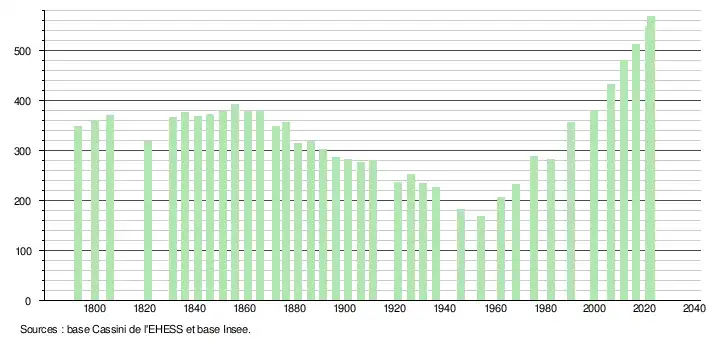 L'évolution du nombre d'habitants est connue à travers les recensements de la population effectués dans la commune depuis 1793. Pour les communes de moins de 10 000 habitants, une enquête de recensement portant sur toute la population est réalisée tous les cinq ans, les populations de référence des années intermédiaires étant quant à elles estimées par interpolation ou extrapolation[17]. Pour la commune, le premier recensement exhaustif entrant dans le cadre du nouveau dispositif a été réalisé en 2006[18].