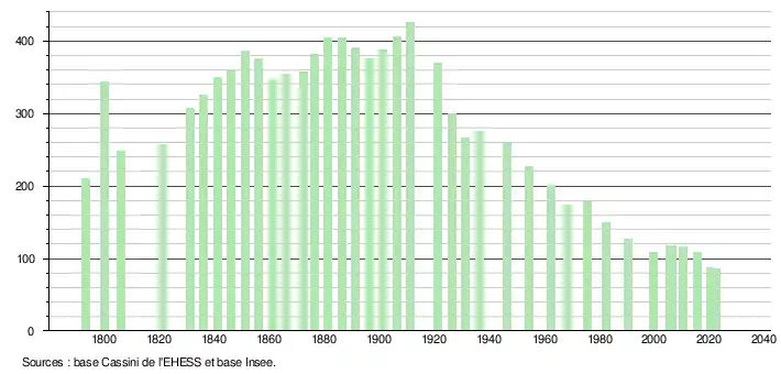 | L'évolution du nombre d'habitants est connue à travers les recensements de la population effectués dans la commune depuis 1793. Pour les communes de moins de 10 000 habitants, une enquête de recensement portant sur toute la population est réalisée tous les cinq ans, les populations de référence des années intermédiaires étant quant à elles estimées par interpolation ou extrapolation[21]. Pour la commune, le premier recensement exhaustif entrant dans le cadre du nouveau dispositif a été réalisé en 2005[22]. En 2022, la commune comptait 85 habitants[Note 1], en évolution de −22,02 % par rapport à 2016 (Corrèze : −0,59 %, France hors Mayotte : +2,11 %). |