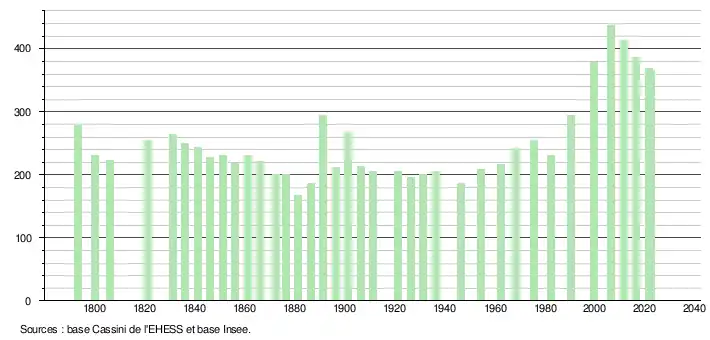 - ↑ Fiches Insee - Populations de référence de la commune pour les années 2006, 2007, 2008, 2009, 2010, 2011, 2012, 2013, 2014, 2015, 2016, 2017, 2018, 2019, 2020, 2021 et 2022.