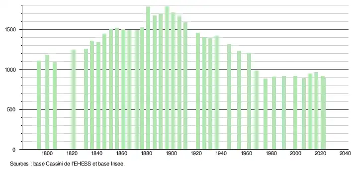 L'évolution du nombre d'habitants est connue à travers les recensements de la population effectués dans la commune depuis 1793. Pour les communes de moins de 10 000 habitants, une enquête de recensement portant sur toute la population est réalisée tous les cinq ans, les populations de référence des années intermédiaires étant quant à elles estimées par interpolation ou extrapolation[23]. Pour la commune, le premier recensement exhaustif entrant dans le cadre du nouveau dispositif a été réalisé en 2006[24].