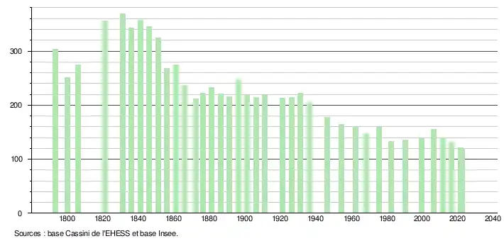 L'évolution du nombre d'habitants est connue à travers les recensements de la population effectués dans la commune depuis 1793. Pour les communes de moins de 10 000 habitants, une enquête de recensement portant sur toute la population est réalisée tous les cinq ans, les populations de référence des années intermédiaires étant quant à elles estimées par interpolation ou extrapolation[21]. Pour la commune, le premier recensement exhaustif entrant dans le cadre du nouveau dispositif a été réalisé en 2006[22].