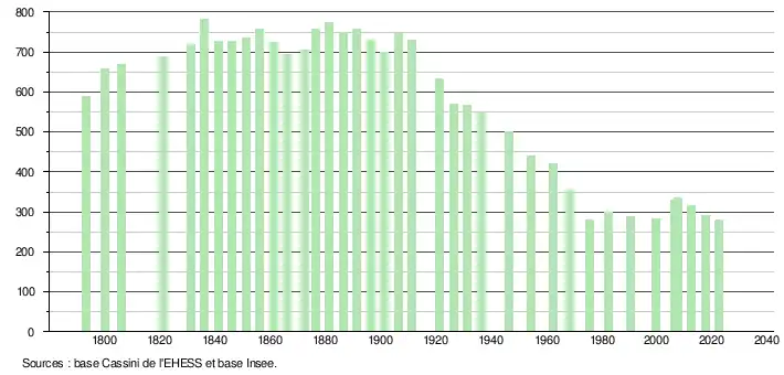 L'évolution du nombre d'habitants est connue à travers les recensements de la population effectués dans la commune depuis 1793. Pour les communes de moins de 10 000 habitants, une enquête de recensement portant sur toute la population est réalisée tous les cinq ans, les populations de référence des années intermédiaires étant quant à elles estimées par interpolation ou extrapolation[29]. Pour la commune, le premier recensement exhaustif entrant dans le cadre du nouveau dispositif a été réalisé en 2007[30].