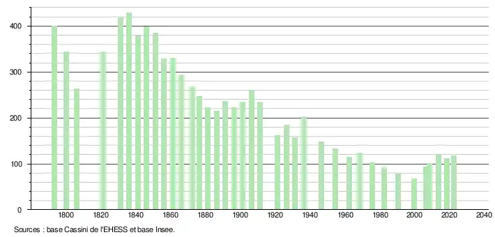 L'évolution du nombre d'habitants est connue à travers les recensements de la population effectués dans la commune depuis 1793. Pour les communes de moins de 10 000 habitants, une enquête de recensement portant sur toute la population est réalisée tous les cinq ans, les populations de référence des années intermédiaires étant quant à elles estimées par interpolation ou extrapolation[21]. Pour la commune, le premier recensement exhaustif entrant dans le cadre du nouveau dispositif a été réalisé en 2008[22].