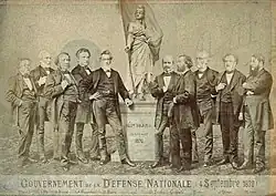 Un « gouvernement de Défense nationale » est ainsi formé. Ses membres se réunissent pour la première fois en Conseil le à 22 h 30, sous la présidence du général Trochu, dans l'ancien bureau du préfet de la Seine à l'hôtel de ville, avec pour mission de se répartir les différents ministères[13]. Ernest Picard revendique l'Intérieur, un poste pour lequel Léon Gambetta s'est autoproclamé dans la soirée en signant déjà plusieurs décrets[13], notamment une circulaire adressée aux préfets pour annoncer la déchéance de l'empereur, la proclamation de la République et la formation du nouveau cabinet[14]. Picard se saisit de ce différend pour demander un vote à bulletin secret, qui confirme Gambetta pour une voix[13]. Il envisage donc de se retirer, mais sous la pression des autres ministres, il accepte finalement le ministère des Finances[13]. Ministre des Affaires étrangères, Jules Favre est désigné à la vice-présidence du Conseil, tandis qu'Adolphe Crémieux reçoit le ministère de la Justice et Jules Simon celui de l'Instruction publique[14]. Nommé délégué du gouvernement, Jules Ferry s'installe à la Préfecture de la Seine[14].