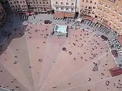 Le Campo est pavé de briques, a la forme d'une coquille et est divisé en neuf parties égales qui pointent vers le Palazzo Pubblico, une référence claire aux Neuf.