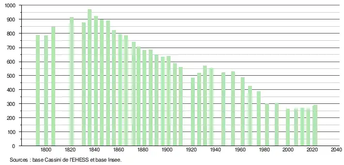 L'évolution du nombre d'habitants est connue à travers les recensements de la population effectués dans la commune depuis 1793. Pour les communes de moins de 10 000 habitants, une enquête de recensement portant sur toute la population est réalisée tous les cinq ans, les populations de référence des années intermédiaires étant quant à elles estimées par interpolation ou extrapolation[29]. Pour la commune, le premier recensement exhaustif entrant dans le cadre du nouveau dispositif a été réalisé en 2006[30].