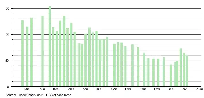 L'évolution du nombre d'habitants est connue à travers les recensements de la population effectués dans la commune depuis 1793. Pour les communes de moins de 10 000 habitants, une enquête de recensement portant sur toute la population est réalisée tous les cinq ans, les populations de référence des années intermédiaires étant quant à elles estimées par interpolation ou extrapolation[16]. Pour la commune, le premier recensement exhaustif entrant dans le cadre du nouveau dispositif a été réalisé en 2008[17].