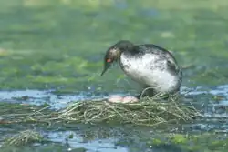 Les deux parents bâtissent un nid formé d'un tas de végétaux en décomposition ancré à la végétation vivante du bord de l'eau. La ponte a lieu entre mars et juillet[3]. Mâle et femelle couvent de 3 à 4 œufs blanc-bleuté qui bruniront au contact des végétaux en décomposition[2]. Les derniers œufs sont parfois abandonnés après l'éclosion des deux premiers, 20 à 21 jours après la ponte[5].