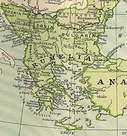 Après 1832, une grande partie des populations de langue et de culture grecque reste sous la domination ottomane tant en Europe (en Épire dans le vilayet de Ioannina, en Thessalie et Macédoine occidentale dans le vilayet de Monastir, en Macédoine centrale dans le vilayet de Salonique, en Thrace dans le vilayet d'Andrinople et en Crète passée sous administration grecque depuis 1898) qu'en Anatolie (sur les côtes égéennes d'Asie mineure, dans les îles de l'Égée orientale formant le vilayet de l'Archipel, le long du littoral anatolien méditerranéen ou pontique, et par endroits en Bithynie, en Cappadoce, en Carie, en Lycie et à Chypre sous administration britannique depuis 1878). Le projet de les unifier, la « Grande Idée », est à l'origine d'une série de révoltes et de conflits jusqu'à la guerre gréco-turque (1919-1922). Héritage de cette séparation, l'organisation de l'Église orthodoxe en Grèce partage les 80 évêchés métropolitains du pays, coordonnés par le Saint-Synode de Grèce, en deux patriarcats autocéphales distincts : celui d'Athènes (à peu de chose près, la Grèce d'avant 1911 soit 44 évêchés métropolitains) et le patriarcat œcuménique de Constantinople (à peu de chose près, les territoires encore ottomans jusqu'en 1911 soit 36 évêchés métropolitains)[33].
