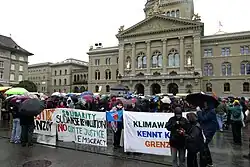 Plusieurs centaines de manifestants non violents ont occupé la Place fédérale (devant le Palais fédéral) dès le au matin, avant d'être évacués par la police mercredi matin[33]. Plus de 2 000 personnes ont ensuite participé à une marche pour le climat le [33]. Les grévistes du climat veulent notamment une loi sur le CO2 plus efficace et la neutralité carbone en 2030[31].