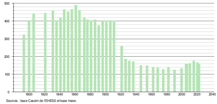 L'évolution du nombre d'habitants est connue à travers les recensements de la population effectués dans la commune depuis 1793. Pour les communes de moins de 10 000 habitants, une enquête de recensement portant sur toute la population est réalisée tous les cinq ans, les populations de référence des années intermédiaires étant quant à elles estimées par interpolation ou extrapolation[28]. Pour la commune, le premier recensement exhaustif entrant dans le cadre du nouveau dispositif a été réalisé en 2005[29].