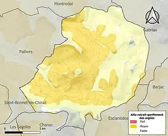 Le retrait-gonflement des sols argileux est susceptible d'engendrer des dommages importants aux bâtiments en cas d’alternance de périodes de sécheresse et de pluie. 50,2 % de la superficie communale est en aléa moyen ou fort (15,8 % au niveau départemental et 48,5 % au niveau national). Sur les 113 bâtiments dénombrés sur la commune en 2019, 97 sont en aléa moyen ou fort, soit 86 %, à comparer aux 14 % au niveau départemental et 54 % au niveau national. Une cartographie de l'exposition du territoire national au retrait gonflement des sols argileux est disponible sur le site du BRGM[22],[Carte 2].