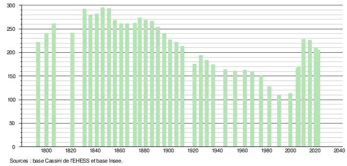 L'évolution du nombre d'habitants est connue à travers les recensements de la population effectués dans la commune depuis 1793. Pour les communes de moins de 10 000 habitants, une enquête de recensement portant sur toute la population est réalisée tous les cinq ans, les populations de référence des années intermédiaires étant quant à elles estimées par interpolation ou extrapolation[24]. Pour la commune, le premier recensement exhaustif entrant dans le cadre du nouveau dispositif a été réalisé en 2005[25].