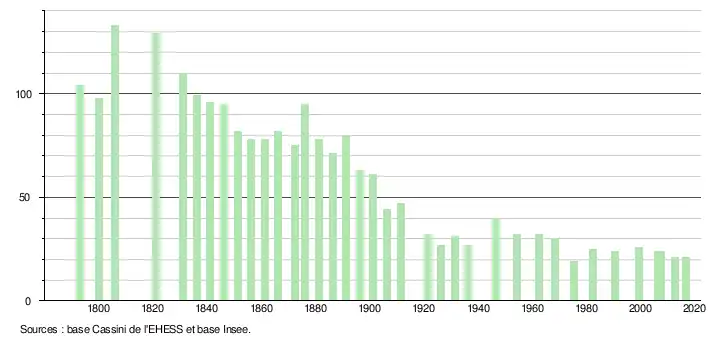 L'évolution du nombre d'habitants est connue à travers les recensements de la population effectués dans la commune depuis 1793. Pour les communes de moins de 10 000 habitants, une enquête de recensement portant sur toute la population est réalisée tous les cinq ans, les populations de référence des années intermédiaires étant quant à elles estimées par interpolation ou extrapolation[19]. Pour la commune, le premier recensement exhaustif entrant dans le cadre du nouveau dispositif a été réalisé en 2007[20].