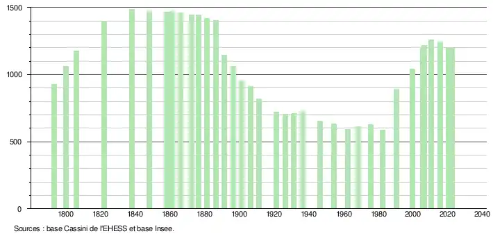 L'évolution du nombre d'habitants est connue à travers les recensements de la population effectués dans la commune depuis 1793. Pour les communes de moins de 10 000 habitants, une enquête de recensement portant sur toute la population est réalisée tous les cinq ans, les populations de référence des années intermédiaires étant quant à elles estimées par interpolation ou extrapolation[13]. Pour la commune, le premier recensement exhaustif entrant dans le cadre du nouveau dispositif a été réalisé en 2005[14].